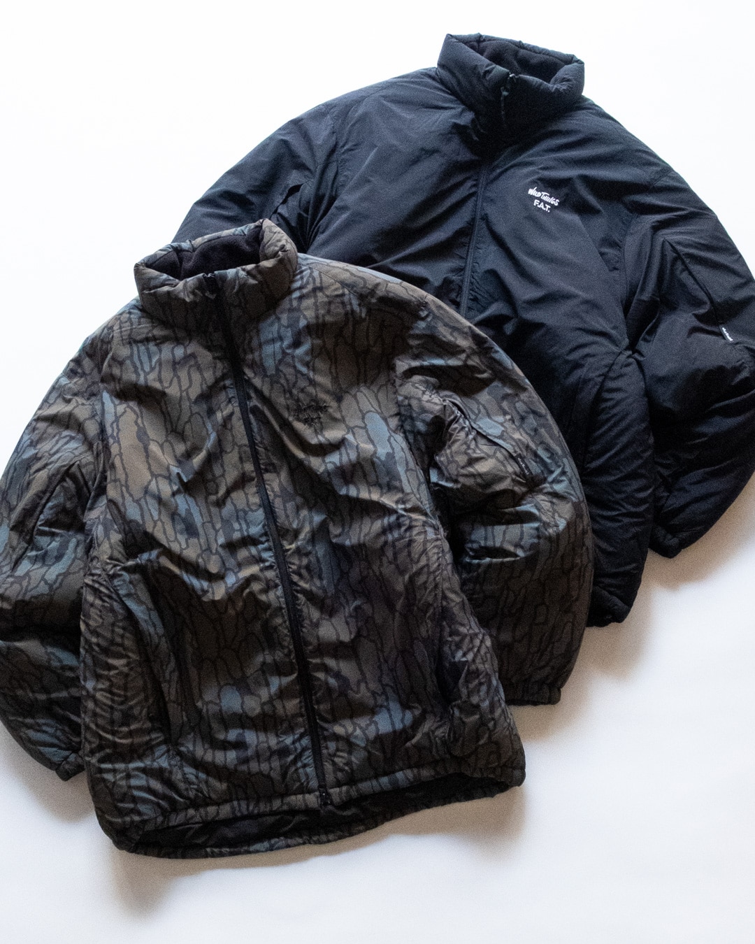 両アイテムとも独特なタッチのナイロンタッサーを使用。ジャケットはモダンなタクティカルデザインをF.A.T.ならではの視点でアレンジしたアイテムにし、中綿にシンサレート素材を採用することで、軽さと断熱性を持ち合わせ、ソリッドかつミニマルな印象を与えるポケットディテールなど、機能性とデザイン性の持ち合わせた1着に。パンツはフロント・バックを縦に切り替えた独特なカッティングによるサイドポケットディテールにより、シンプルかつミニマルなデザインが特徴的。