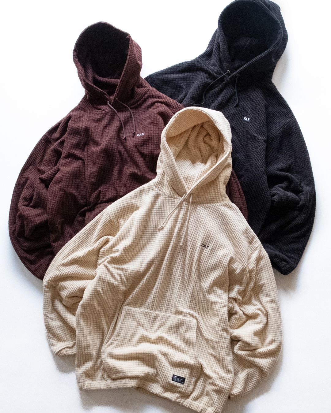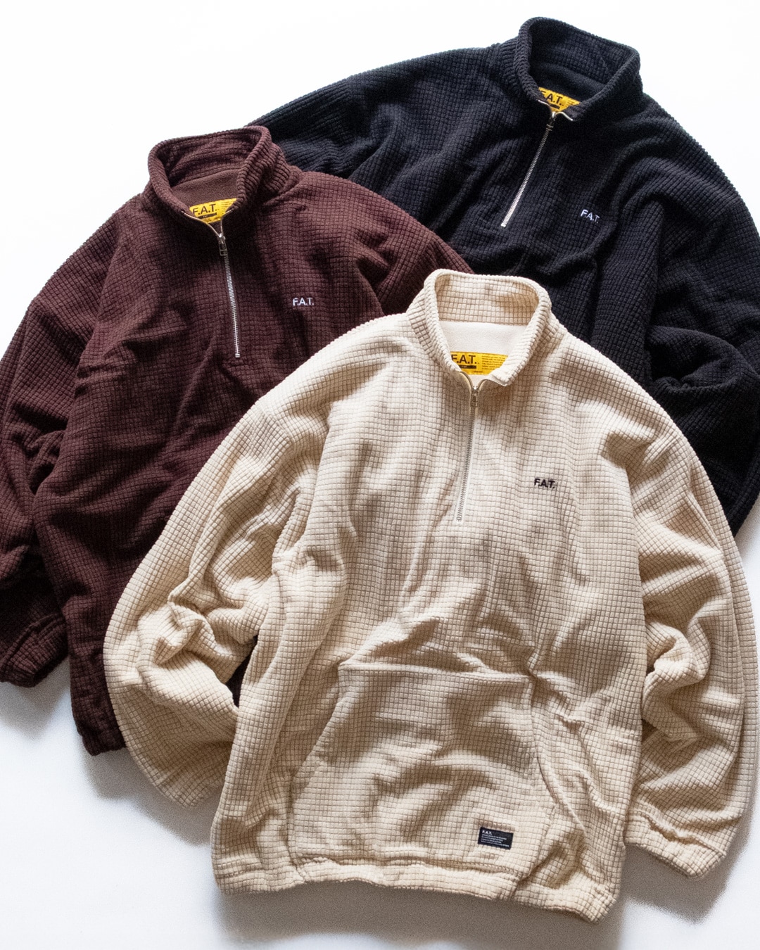 独特な表面感のグリッドフリースを使用したプルオーバーパーカー「GRIDOVER」とハーフジップスウェット「GRIDUP」シンプルなスタイルながらもマイクロフリースをライニングに採用することで、防寒性の高いインナーとして活躍してくれるアイテム。
